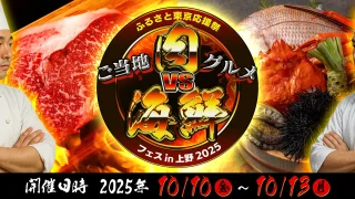 2025/10/10~2025/10/13 台東区食イベント上野公園 東京23区 ふるさと東京応援祭 ご当地グルメ 肉VS海鮮フェス(2025年10月10日~13日 上野公園) ジューシーな肉料理と新鮮な海鮮グルメが大集結!全国各地の厳選食材を使った絶品メニューが勢ぞろいし、肉派も海鮮派も大満足間違いなし!開催概要イベント名:ふるさと東京応援祭 ご当地グルメ 肉VS海鮮フェスin上野2025開催日時:2025年10... 東京23区