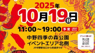 10月19日(日) 中野セントラルパーク・四季の森公園中野区 東京23区 第34回 アシバ祭 (2025年10月19日 中野四季の森公園) アシバ祭は、1985年の第1回から東京沖縄県人会青年部が守り続けてきた、大切なお祭りです。「アシバ」という言葉には二つの意味があります。ひとつは沖縄の方言で“みんなで遊ぼうよ!”という意味の「遊ば(あしば)」。もうひとつは、沖縄出身の青年た... 東京23区