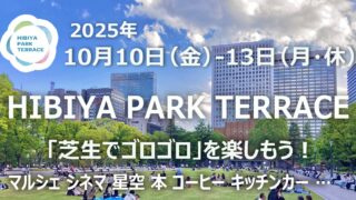 2025/10/10~2025/10/13 千代田区日比谷公園 東京23区 HIBIYA PARK TERRACE(2025年10月10日~13日 日比谷公園) 今年は、昨年新たにオープンした芝庭広場を会場に映画やマルシェ、キッチンカーなど4日間に盛りだくさんのコンテンツを詰め込んでいます。テーマは「芝生でゴロゴロを楽しもう!」。開催概要開催日時:2025年10月10日(金)~13日(月祝) 12:... 東京23区