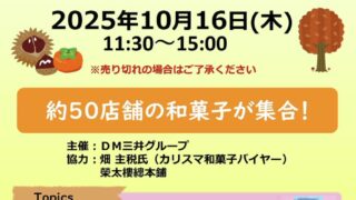 10月16日(木)★ 食イベント港区 東京23区 第18回 和菓子縁日(2025年10月16日 港区・DM三井製糖本社) 開催概要開催日時:2025年10月16日(木) 11:30~15:00開催場所:DM三井製糖本社ビル前(JR田町駅・地下鉄三田駅より徒歩3分)主催:DM三井グループ※キャッシュレス対応(現金でのお支払いはできません)今回は、港区立障害保健福... 東京23区