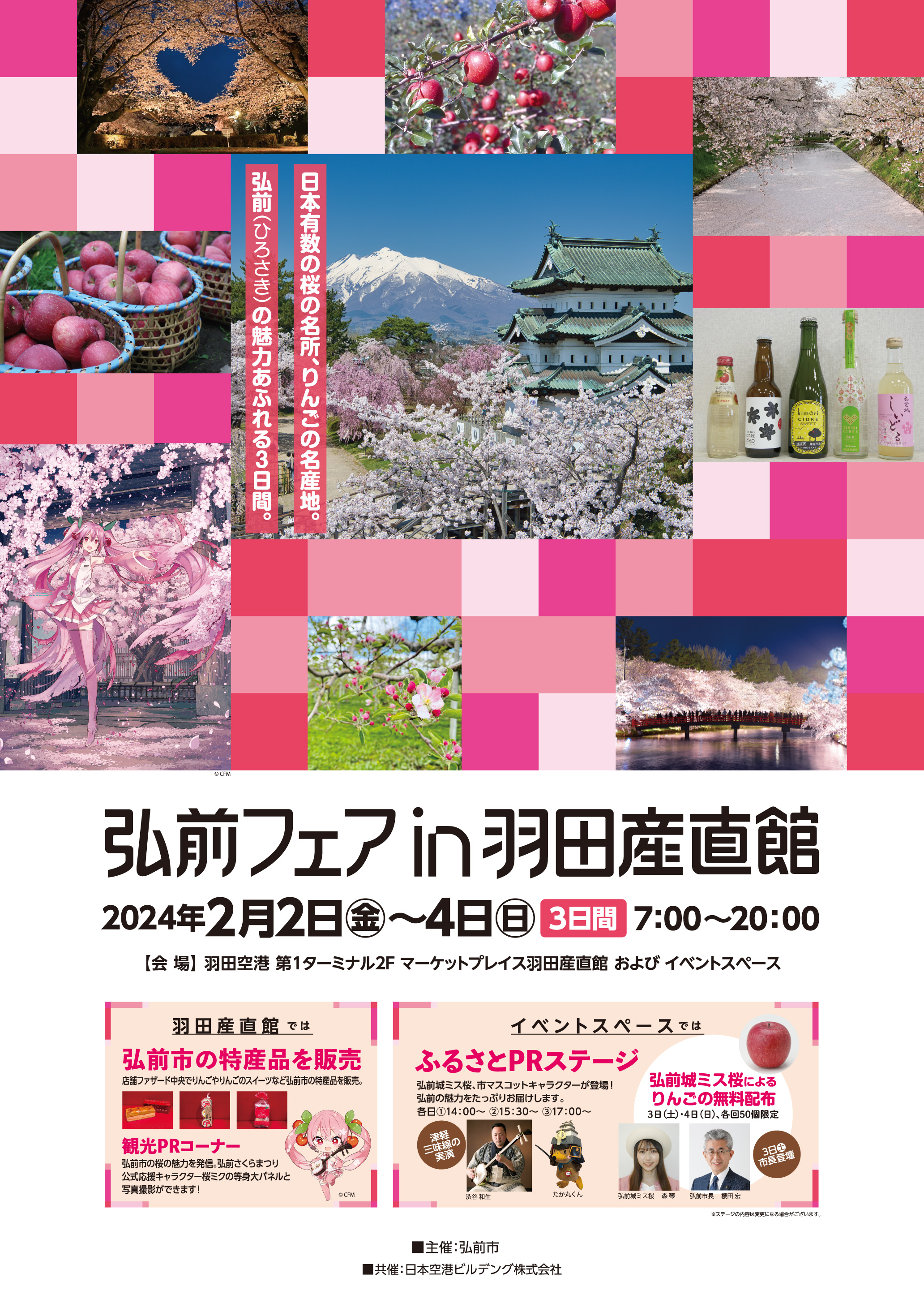 青森県弘前市では、日本有数の桜の名所である弘前公園の桜と、日本一の生産量を誇る弘前りんごをPRし、更なる誘客を促進するため、羽田空港第1ターミナルにおいて2024年2月2日から2月4日までの3日間限定...