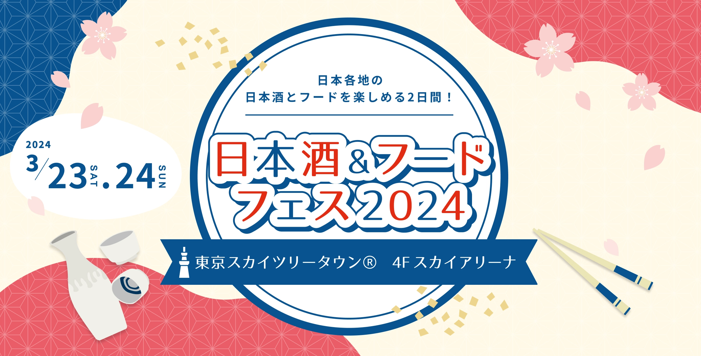 日本酒フェスは、2024年3月23日(土)、24日(日)に 東京スカイツリータウン(R) 4Fスカイアリーナで開催されます。日本各地の日本酒とご当地グルメが楽しめる「日本酒フェス2024」にどうぞお越しください