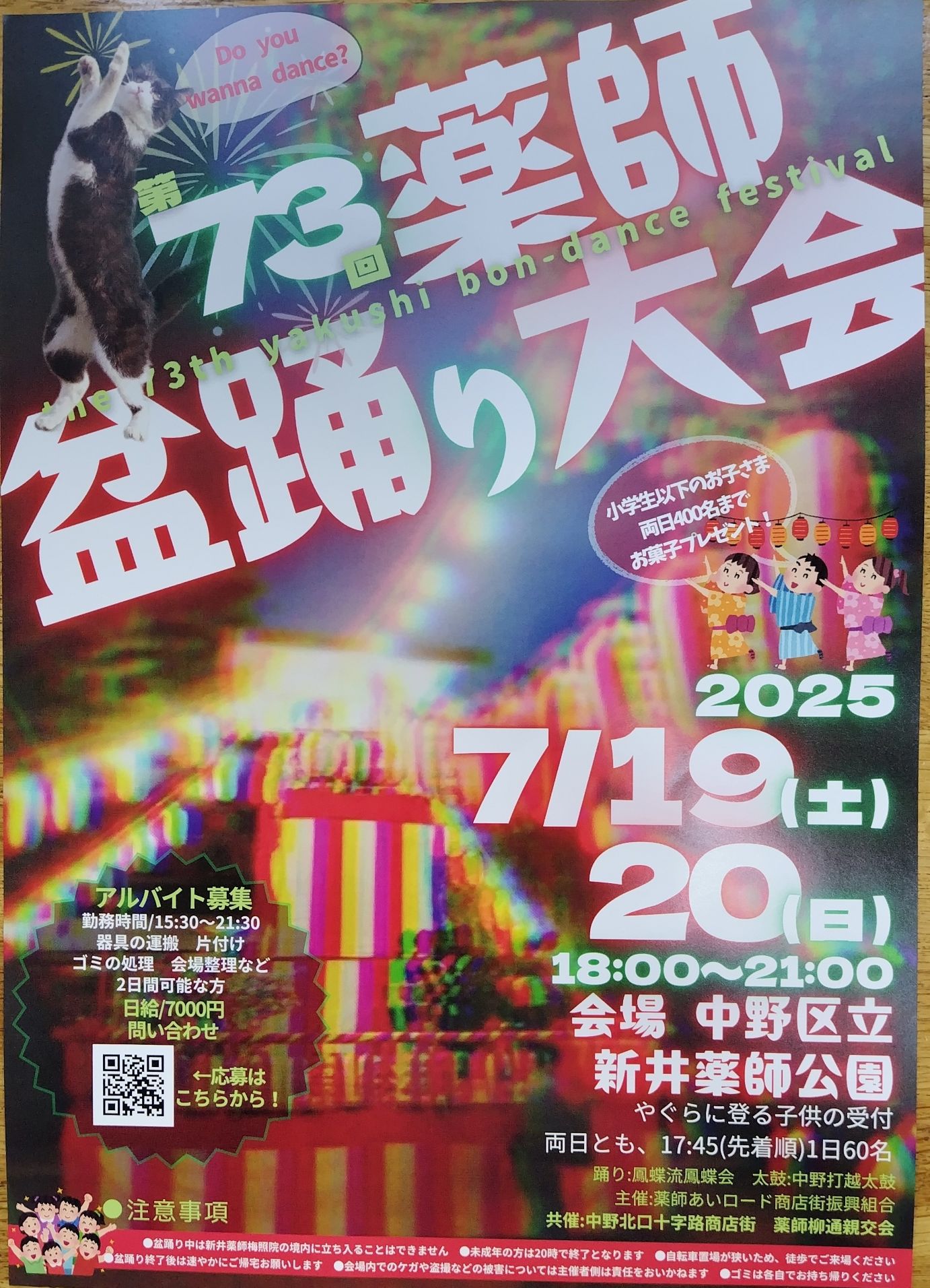 2025年7月19日(土)~20日(日)18時~21時 ※子供時間は18時~20時迄です。 会場は、新井薬師公園です。 小学生以下のお子さんに毎日先着400個お菓子配布!! 楽しく元気にみんなで踊りましょう。