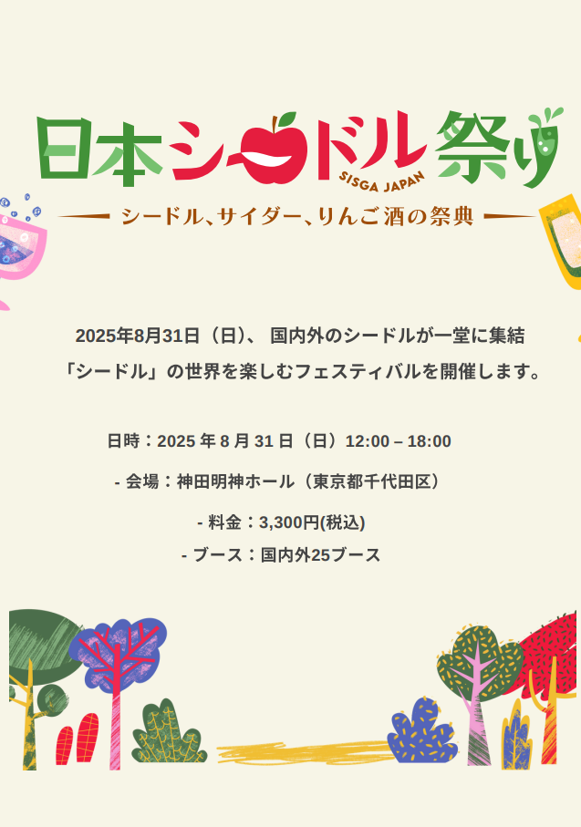 本イベントは、スペイン本部の国際シードル組織「SISGA(Salón Internacional de les Sidres de Gala)」の日本版として開催されるもので、“シードルの裾野を広げていく”を合言葉に、全国・海外から約30組のシードル生産者・関係者が集結。試飲・販売・フードペアリング・国際品評会・体験企画など、五感で楽しめる日本最大級のシードルイベントです。