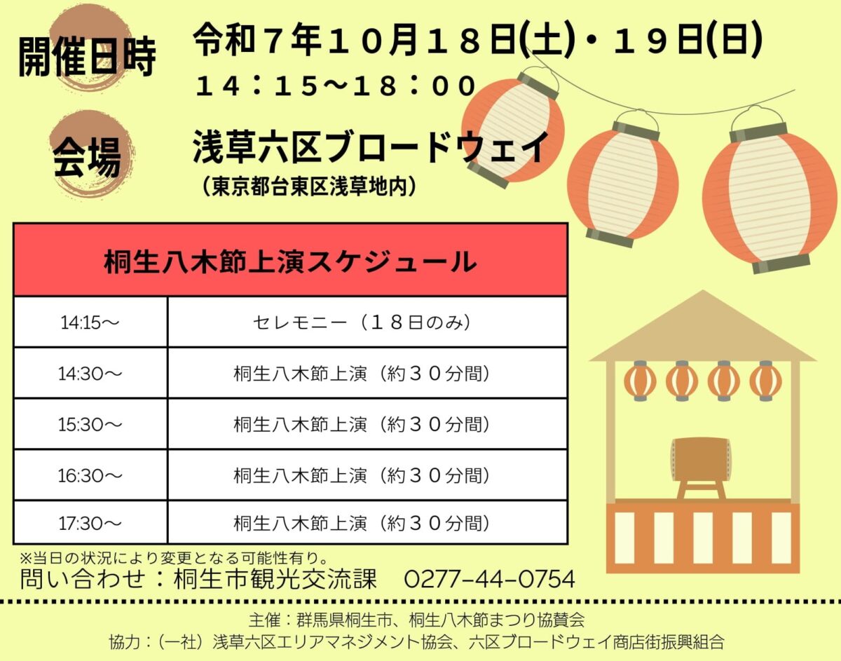 東京都台東区浅草六区ブロードウェイ商店街において、桐生八木節まつりを再現し桐生市の魅力を発信します。