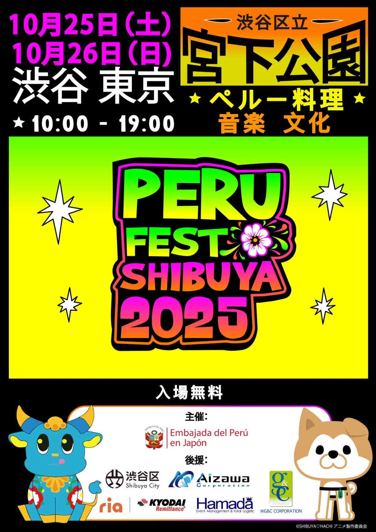 東京23区 宮下公園国際イベント渋谷区 ペルー フェスト シブヤ 2025(10月25日~26日 宮下公園) 2025年10月25日(土)~10月26日(日) 東京23区 目次開催概要アクセス主催者サイト・関連サイト 開催概要 日時:2025年10月25日(土)~26(日) 10:00~19:00 場所:宮下公園 入場無料 アクセス JR 山手線・埼京線・湘南新宿ライン・東京メトロ半蔵門線・銀座線・副都心線・東急東横線・田園都市線・京王井の頭線「渋谷」駅 徒歩3分 主催者サイト・関連サイト Instagram Facebook