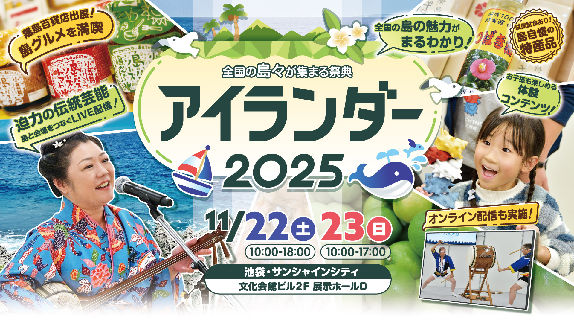 全国の島々が集まる祭典 アイランダー2025【来場無料・オンライン配信あり】11月22日(土)・23日(日)池袋・サンシャインシティにて「アイランダー」開催!島直送の特産品販売■島グルメの満喫■伝統芸能のステージ■島の魅力発信や求人・移住相...