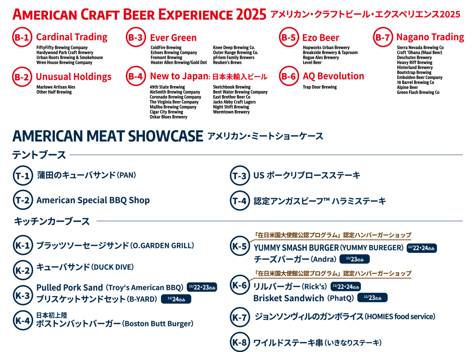 日本初開催!スロークックされたバーベキューをはじめ、米国産ミートをじっくり味わえる本格的アメリカンフードブース11社を集めた「アメリカン・ミート・ショーケース」と、全米から直輸入された選りすぐりのクラフトビールブース9社を新鮮なまま味わえる「アメリカン クラフトビア エクスペリエンス」が、同時に楽しめる夢の祭典です。