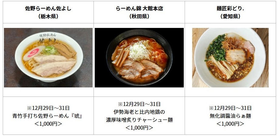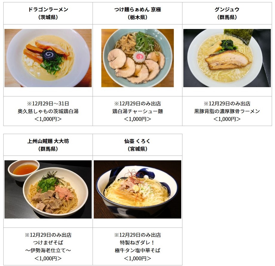 開催期間中、ミシュランガイド京都5年連続掲載食べログ百名店2019・2023選出の「煮干しそば鶏そば藍」やミシュランガイド宮城(仙台)2017特別版掲載・ラーメンWalker宮城2025金賞受賞の「仙臺くろく」をはじめ全国の人気ラーメン11店舗がTCKに集結します。さらに、餃子や台湾小籠包、中津からあげ、ドリンクなどラーメンフェスをさらに盛り上げる4店舗も出店。ラーメンのお供としてお楽しみいただけます。