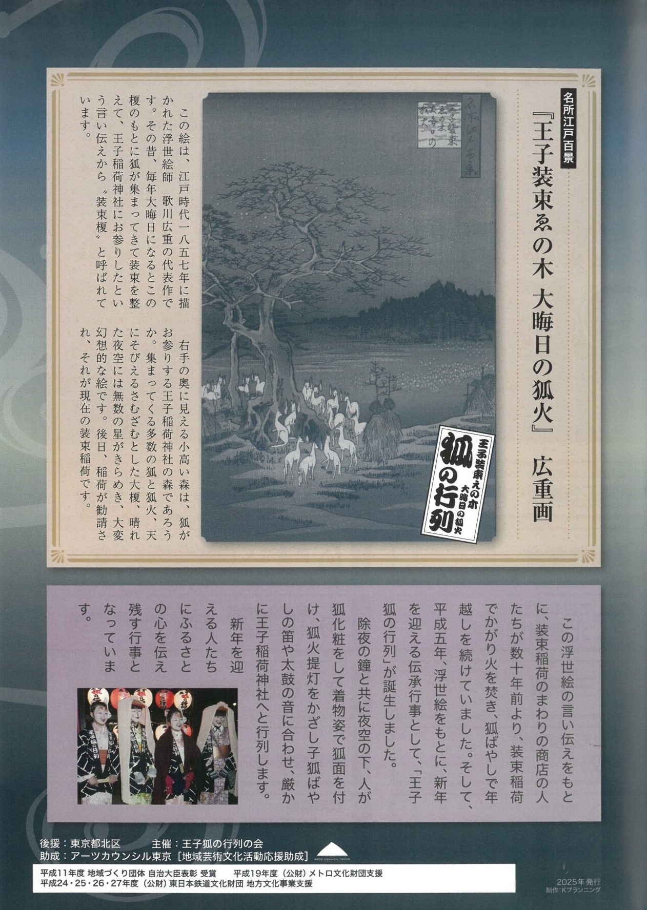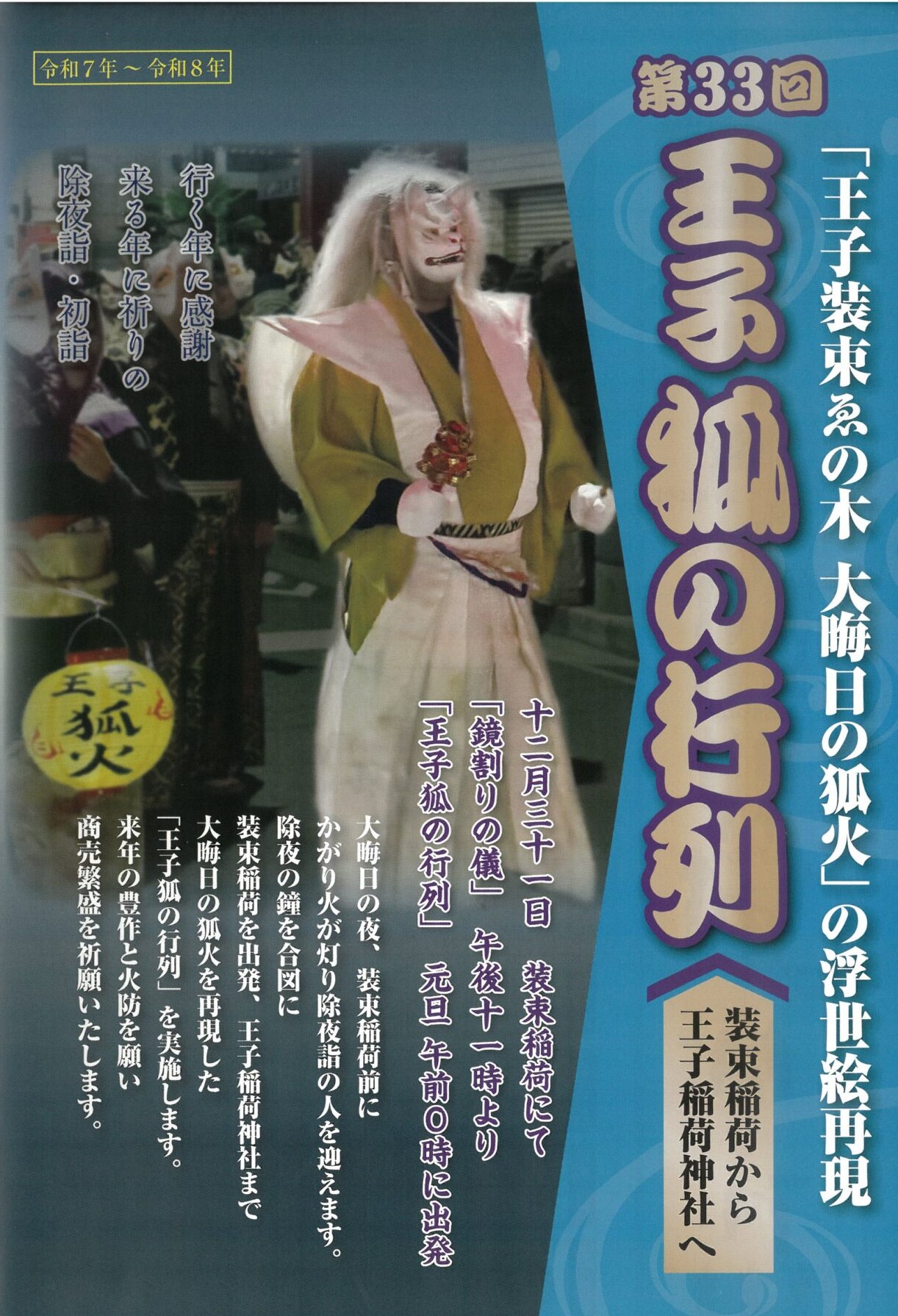 東京23区 クリスマス・正月北区 第33回 王子 狐の行列(2025年12月31日 装束稲荷~王子稲荷神社) 2025/12/31 東京23区 目次開催概要アクセス主催者サイト・関連サイト 開催概要 開催日時:2025年12月31日(火) 23:00~ 開催場所:装束稲荷から王子稲荷神社へ 主催:王子 狐の行列の会 アクセス JR王子駅 徒歩5分 主催者サイト・関連サイト 王子 狐の行列 公式サイト | 浮世絵「王子装束ゑの木 大晦日の狐火」の再現