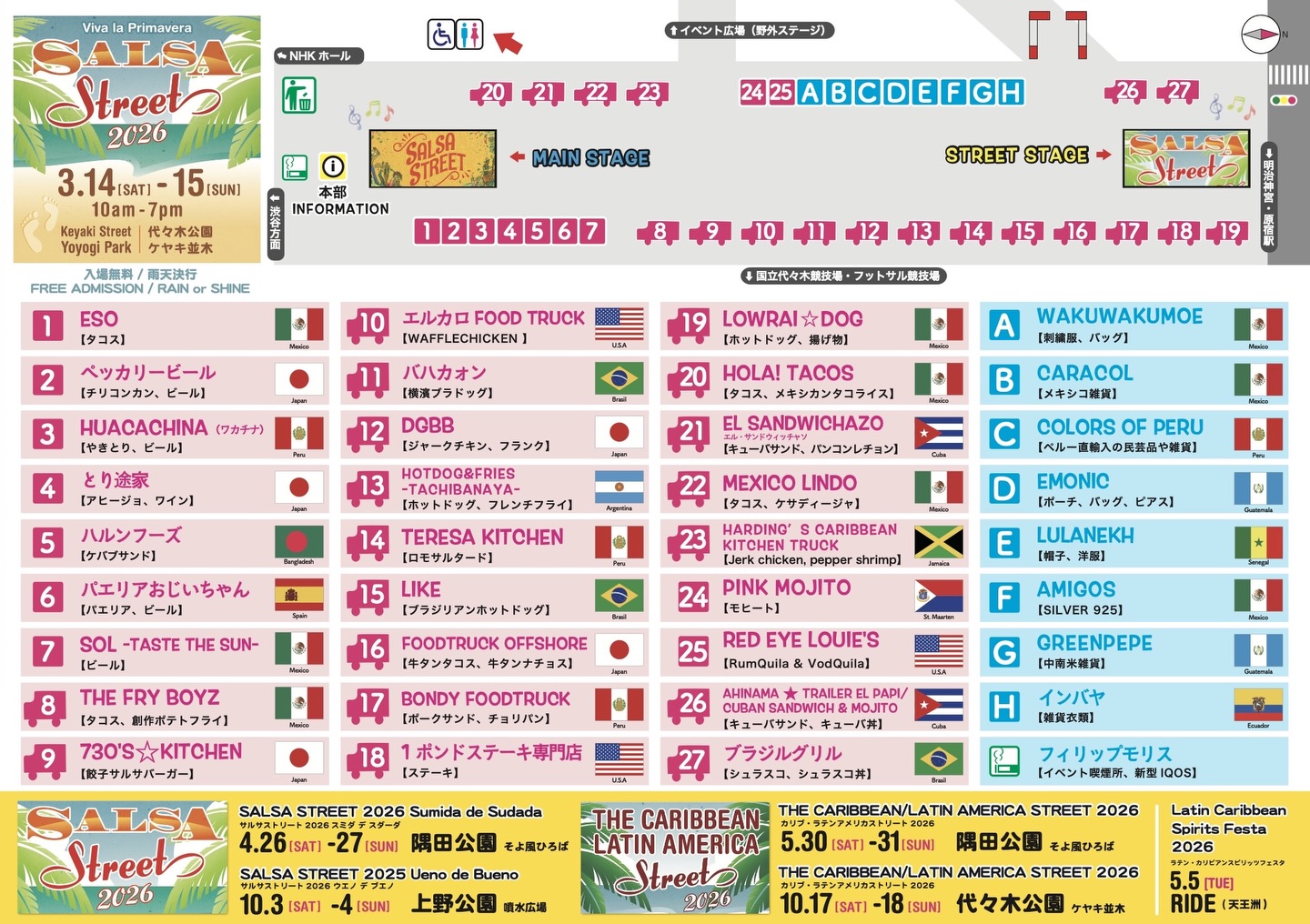 東京23区 ラテン・サンバ渋谷区代々木公園 サルサストリート2026 春(3月14日~15日 代々木公園) 2026/03/14~2026/03/15 東京23区 目次開催概要出店者タイムテーブル主催者サイト・関連サイト 開催概要 開催日時:2026年3月14日(土)~15日(日) 10:00~19:00 開催場所:代々木公園 ケヤキ並木 入場無料・雨天決行 出店者 タイムテーブル 主催者サイト・関連サイト Salsa Street – West Savanna Street Facebook