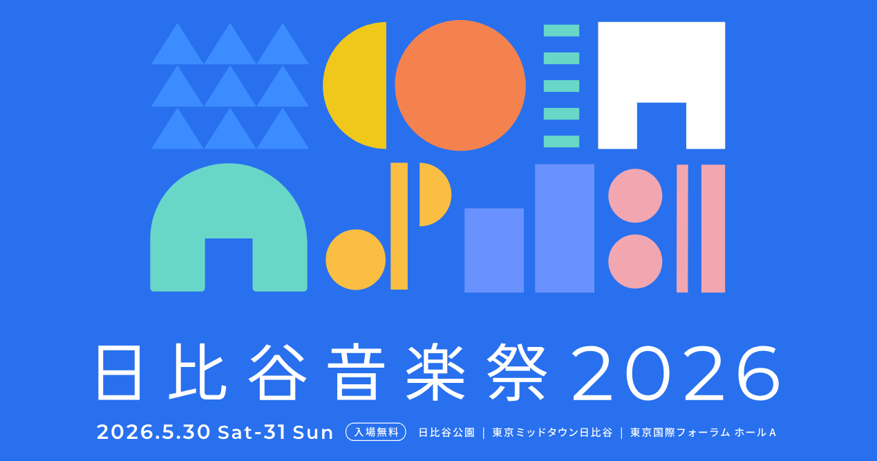 日比谷音楽祭 2026 2026.5.30(Sat) - 31(Sun) : 日比谷音楽祭は、日本の野外コンサートの歴史をつくってきた音楽の聖地「野音」を擁する日比谷公園で、 素晴らしい音楽を体験できる、誰もに開かれた音楽イベントです。