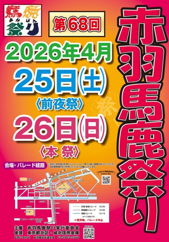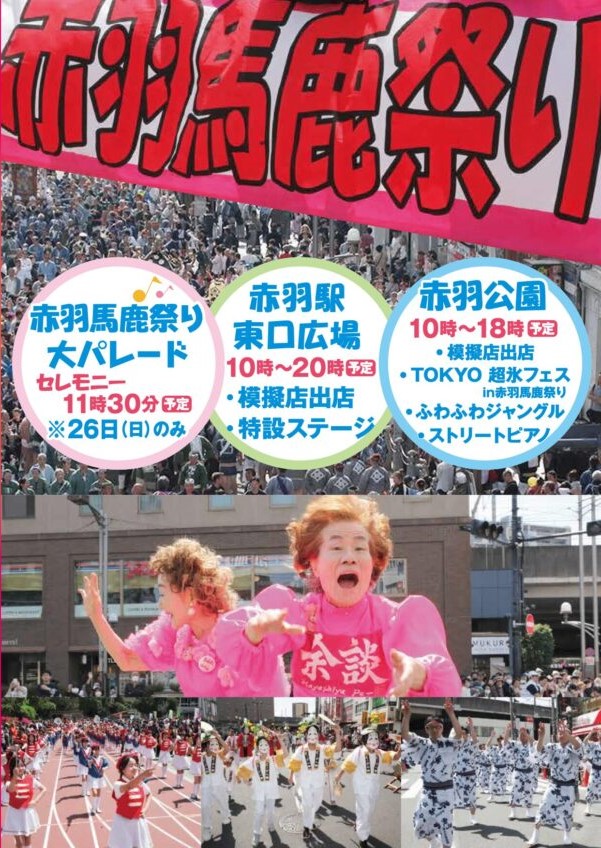 音楽隊によるマーチング演奏からはじまり、馬鹿踊り、仮装、御輿行列と様々なパレード隊が行進し盛り上げる赤羽馬鹿祭りは、春の北区赤羽を華やかに盛り上げて、毎年数十万人の来場者が訪れる北区最大級のイベントとなっています。