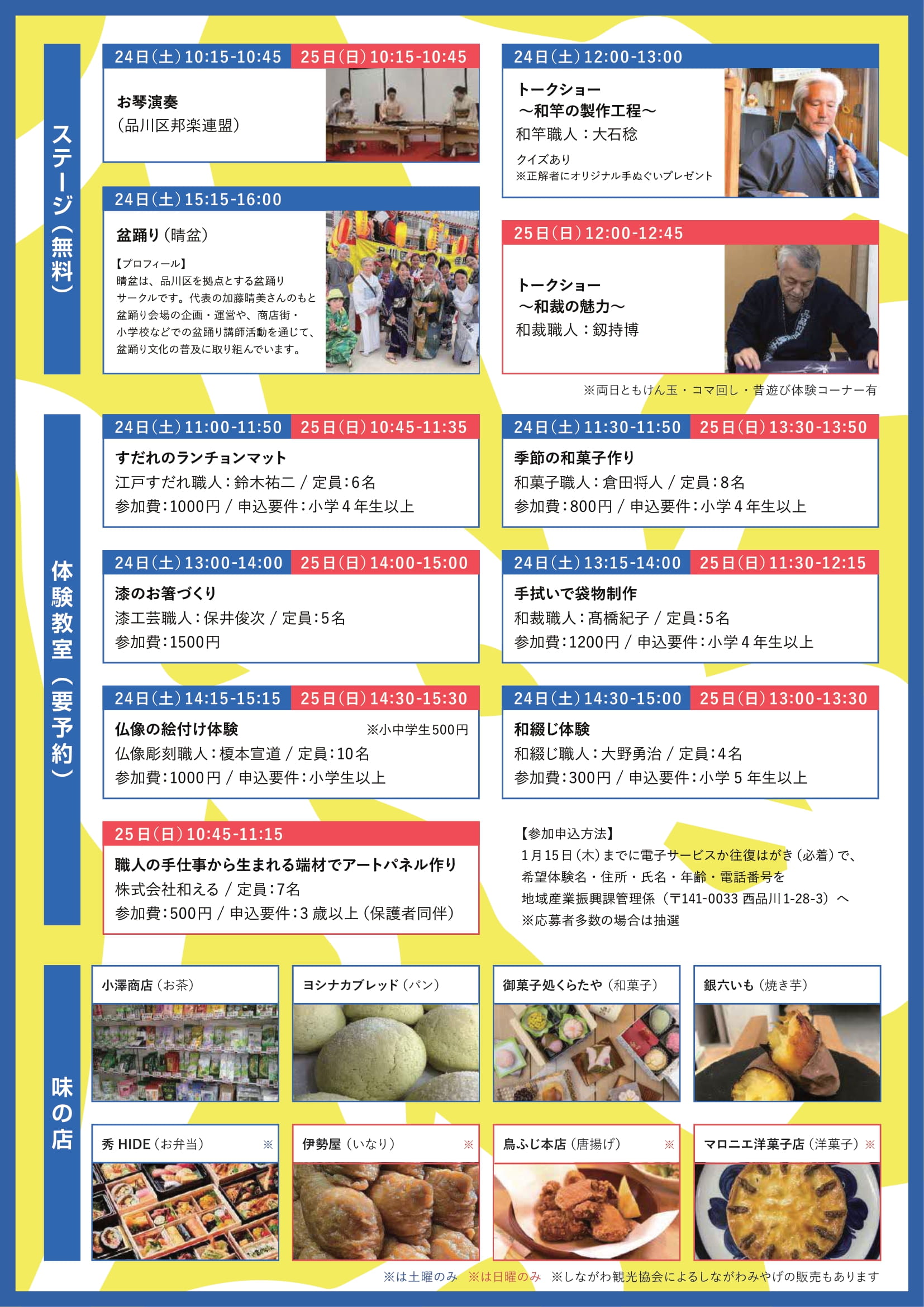 色鮮やかな江戸切子、和裁、草木染手機織物など、品川区の伝統工芸保存会の職人の実演ブースが並び、品川で育まれた伝統と歴史に触れ、職人の話を聞くこともできます。伝統工芸のほか、和菓子やお茶など、伝統の味もあります。