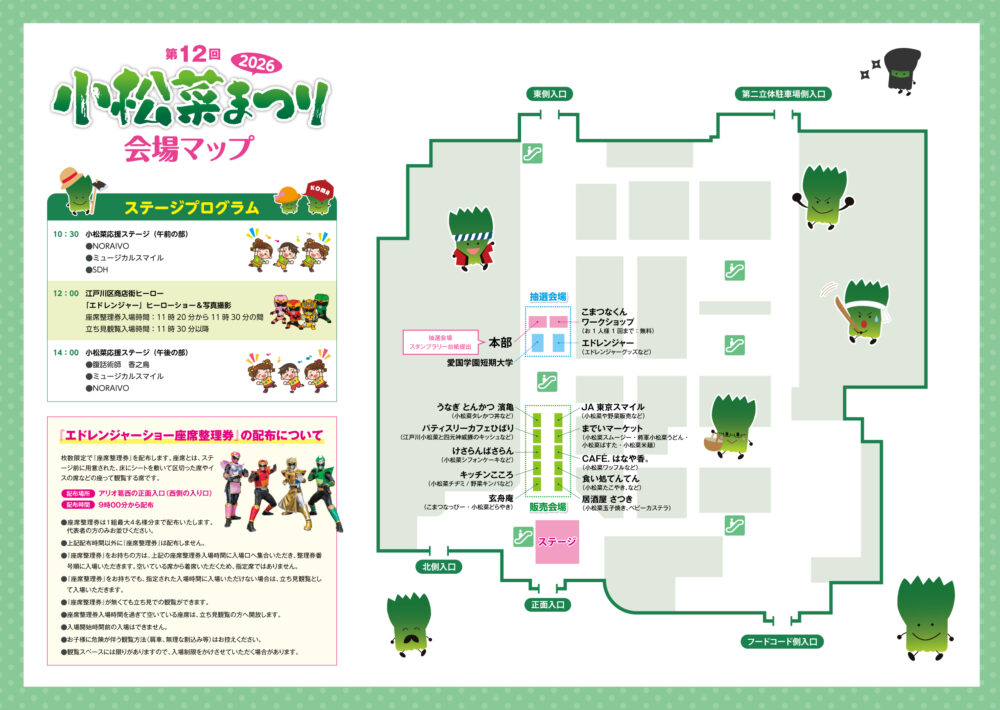 江戸川区内の飲食店などが集まり、小松菜関連商品や小松菜をはじめとした新鮮野菜を販売します。また、会場内では現在開催中の「小松菜グルメスタンプラリー」のスタンプがたくさん集まるチャンスです。さらに、小松菜応援ステージや、江戸川区商店街ヒーロー「エドレンジャー」のヒーローショーなど楽しい催しが盛りだくさんです。