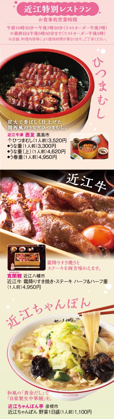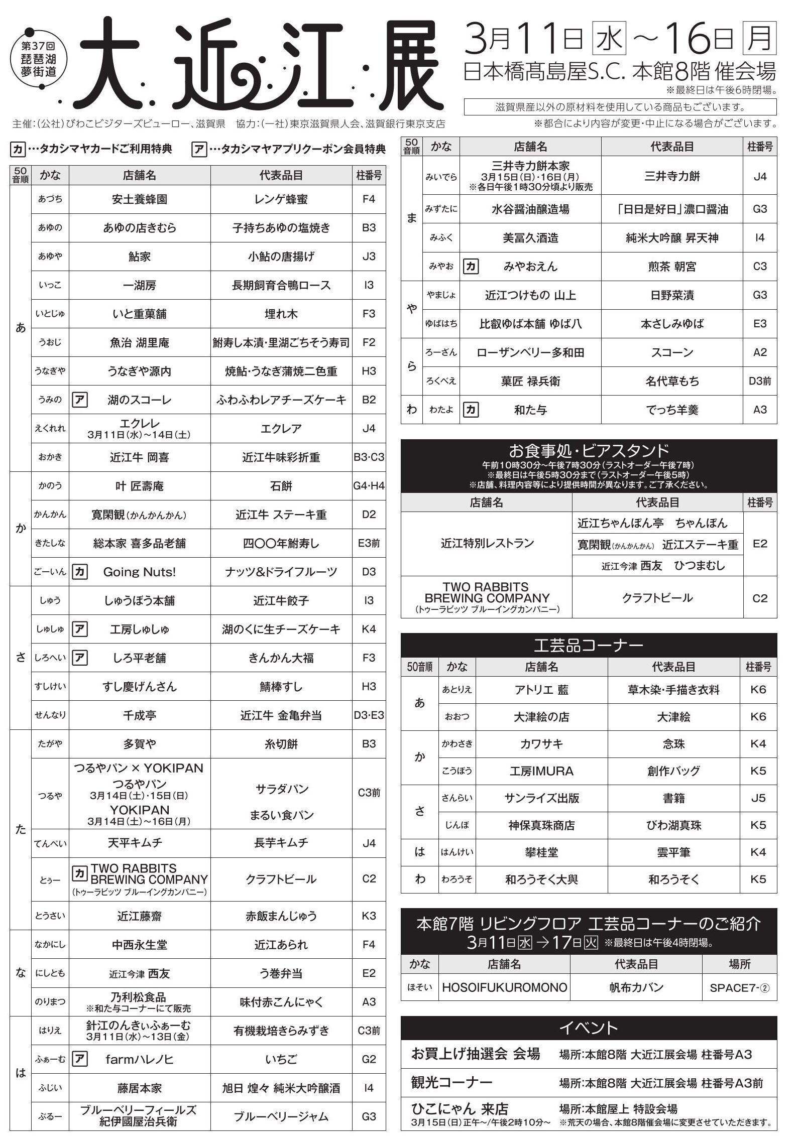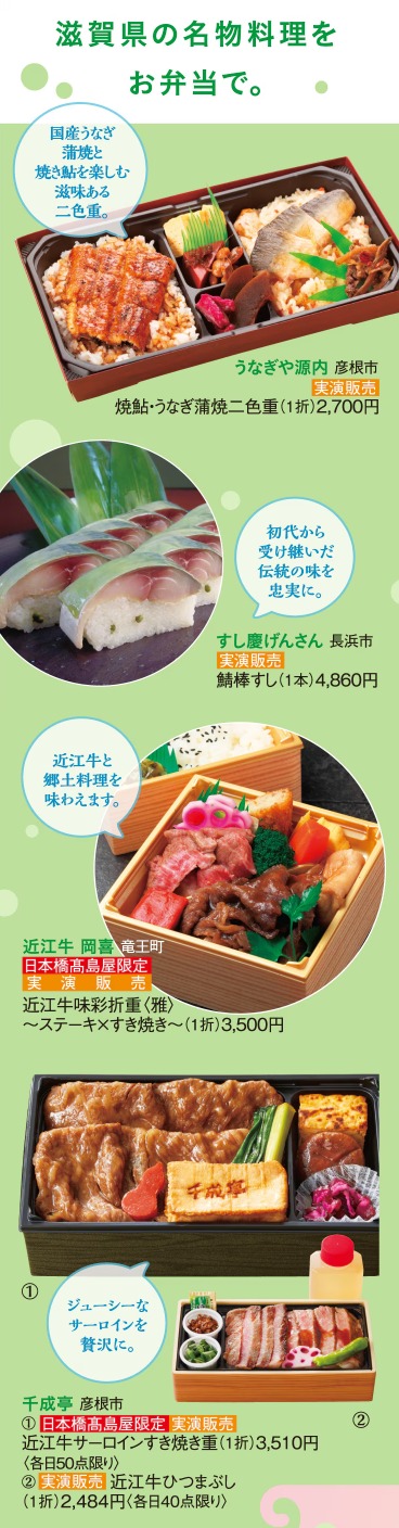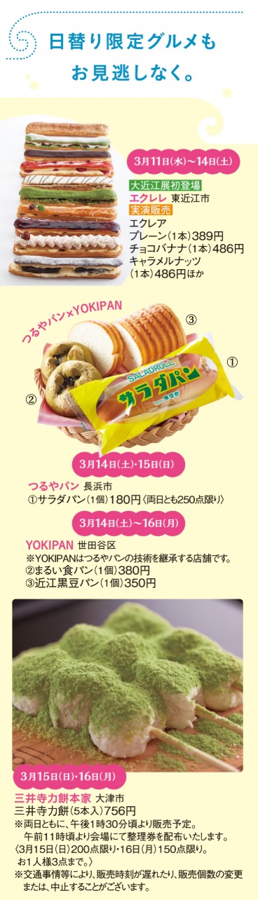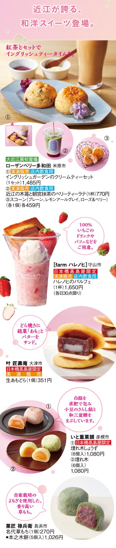 日本橋高島屋S.C.本館8階催会場では、3月11日(水)〜16日(月)まで『大近江展』を開催。近江特別レストランをはじめ名物からスイーツまで、湖国グルメが集結。自然と風土が育んだ工芸品などもご紹介します。