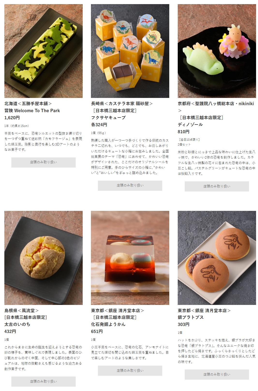 全国の老舗・名店の卓越した技術と研究により悠久のお菓子史に新たなビジュアルとおいしさを更新。化石や地層モチーフのお菓子や、マスコットみたいな恐竜のお菓子などおいしくて楽しい創作菓子の数々を揃え全国銘菓展初!「お菓子の恐竜展」開催!