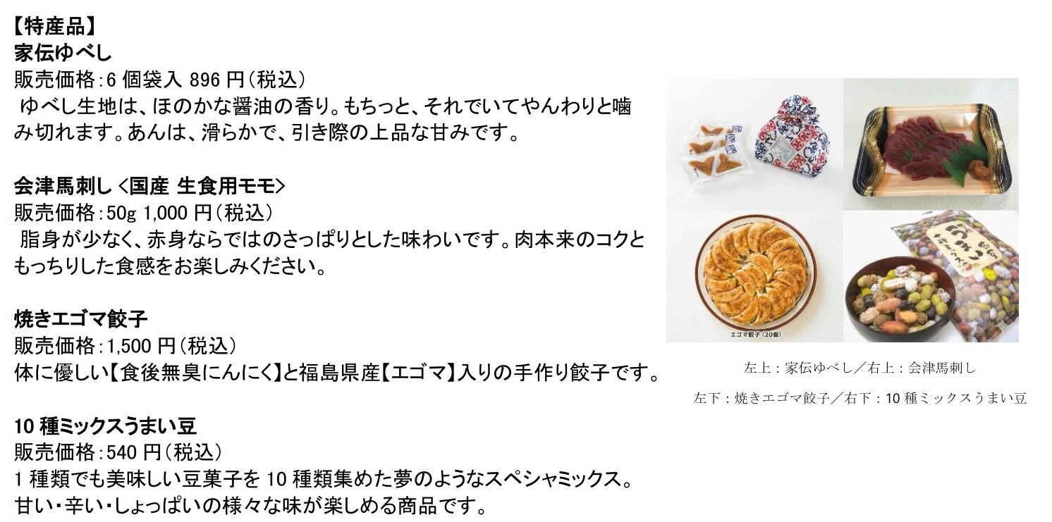 同会場で開催の「福島産直市」では、試飲で気に入ったお酒はもちろん、普段は福島県内でしか手に入らない希少な地酒や、厳選された土産菓子を多数取り揃えます。