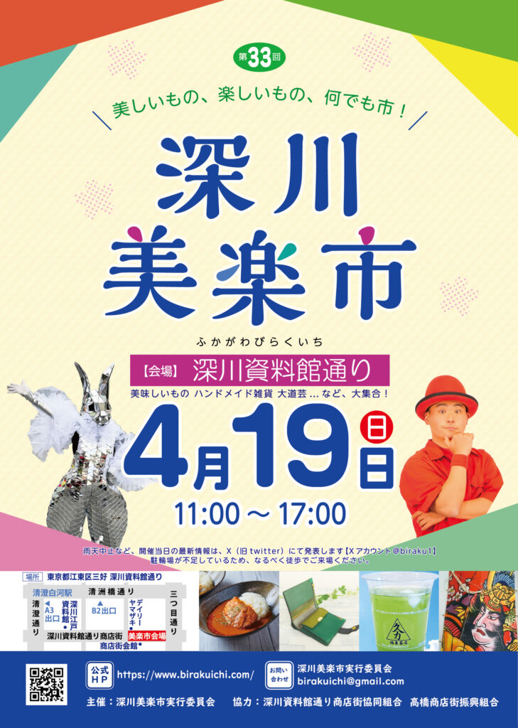 深川美楽市は、美味しいもの・美しいもの・楽しいもの・なんでも市、として深川の街を彩ります。