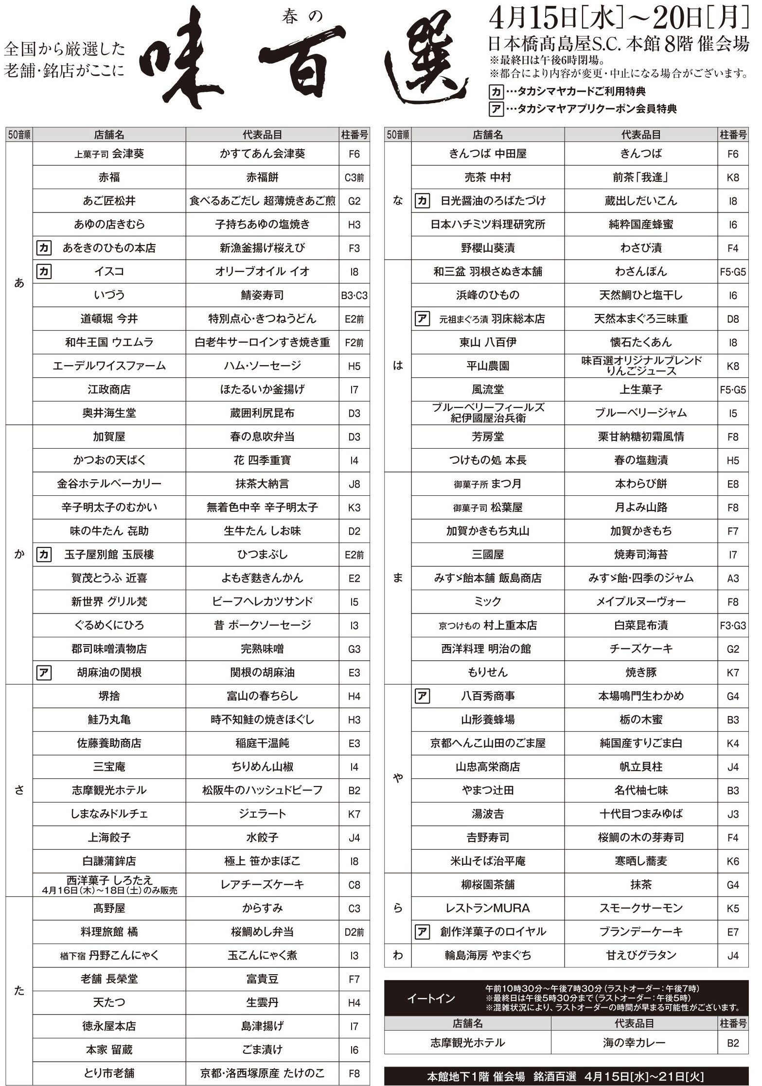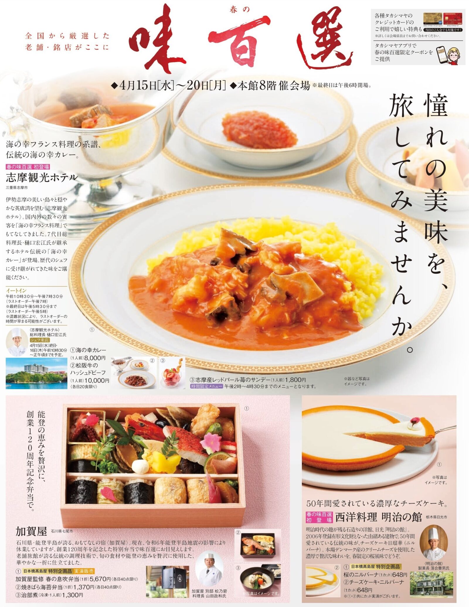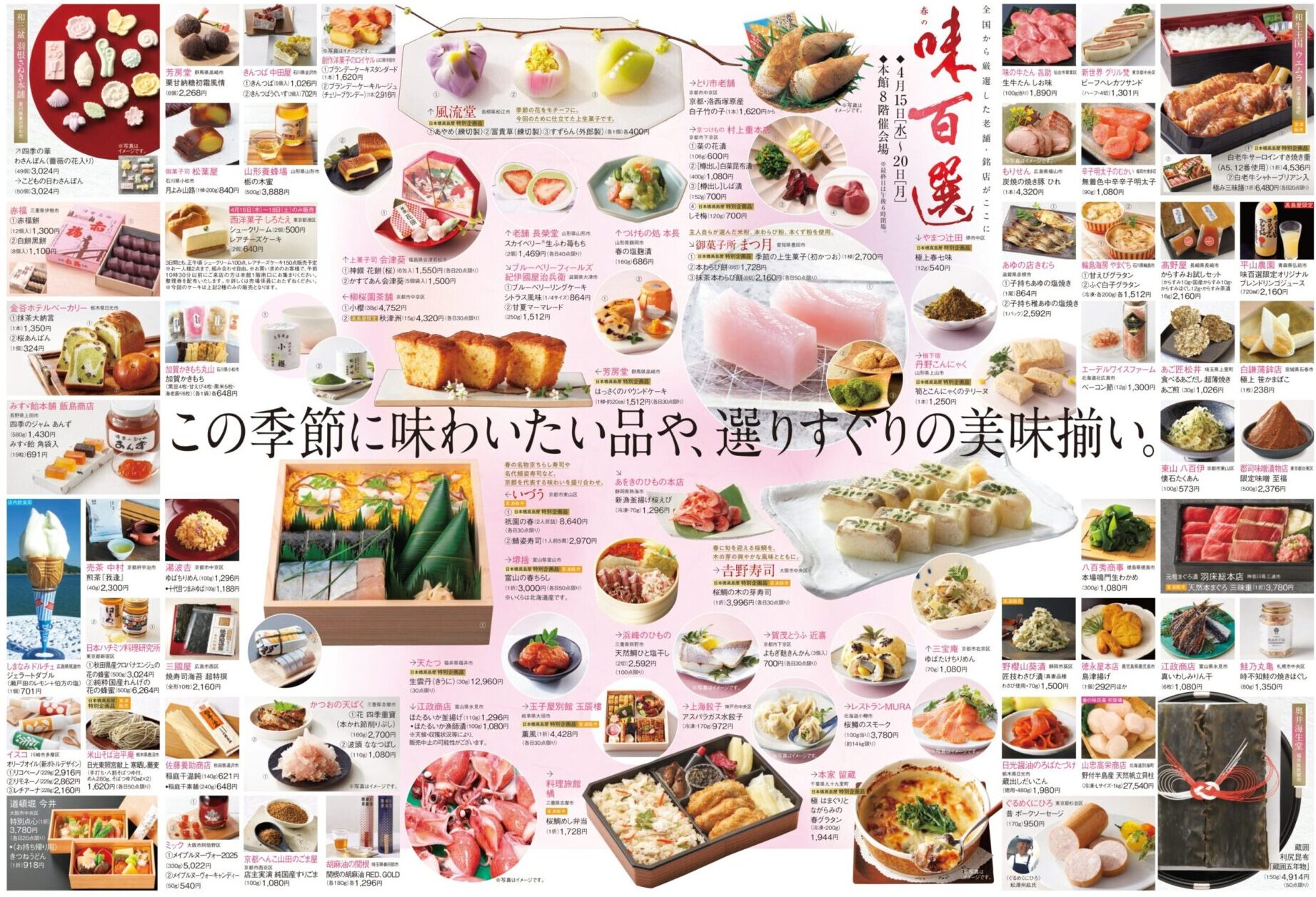 日本橋高島屋S.C.本館8階催会場では、4月15日(水)〜20日(月)まで『春の味百選』を開催。全国から厳選した老舗・銘店がここに。春ならではの旬の味わいや、伝統の技に磨かれた美味をお楽しみください。