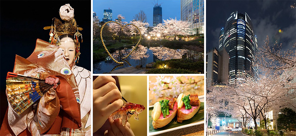 陽光に照らされる日中の桜とは違った一面を見せる、六本木ヒルズの夜桜は、幻想的で美しく、夜の街を彩ります。毛利庭園では、毛利池をはじめ、滝のせせらぎなど、自然とともに夜桜を鑑賞できます。また、約 400 メートルの桜並木が続く六本木さくら坂では、六本木ヒルズの開業時に植えられたソメイヨシノ 75 本が、20 年の時を経て、道を覆うほどの桜並木に成長しています。都心にいることを忘れさせる、美しくライトアップされた夜桜を観ながら散策をお楽しみください。