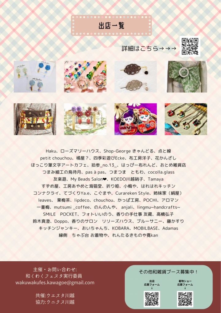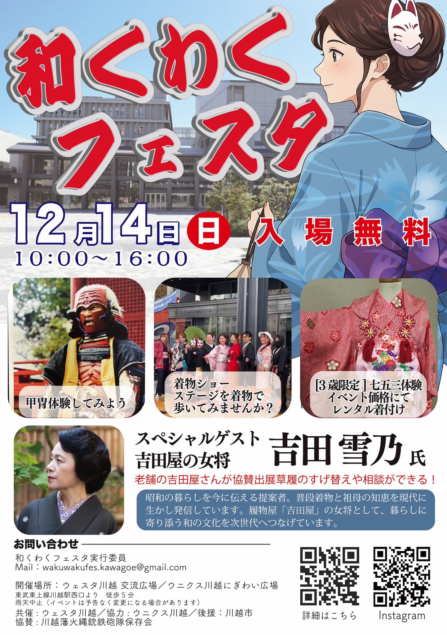 埼玉県 川越市 和くわくフェスタ(2025年12月14日 ウエスタ川越ほか) 2025年12月14日(日) 埼玉県 目次開催概要アクセス主催者サイト・関連サイト 開催概要 開催日時:2025年12月14日(日) 10:00~16:00 開催場所:ウェスタ川越交流広場、ウニクス川越にぎわい広場 主催:和くわくフェスタ実行委員 入場無料 アクセス 主催者サイト・関連サイト X