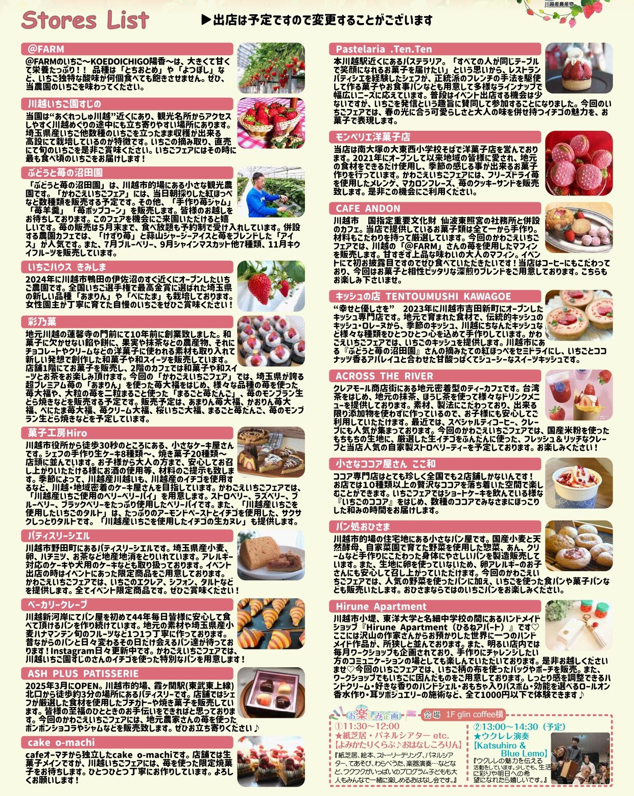 川越のイチゴ農家の他、お菓子などイチゴメニューが勢揃いします。