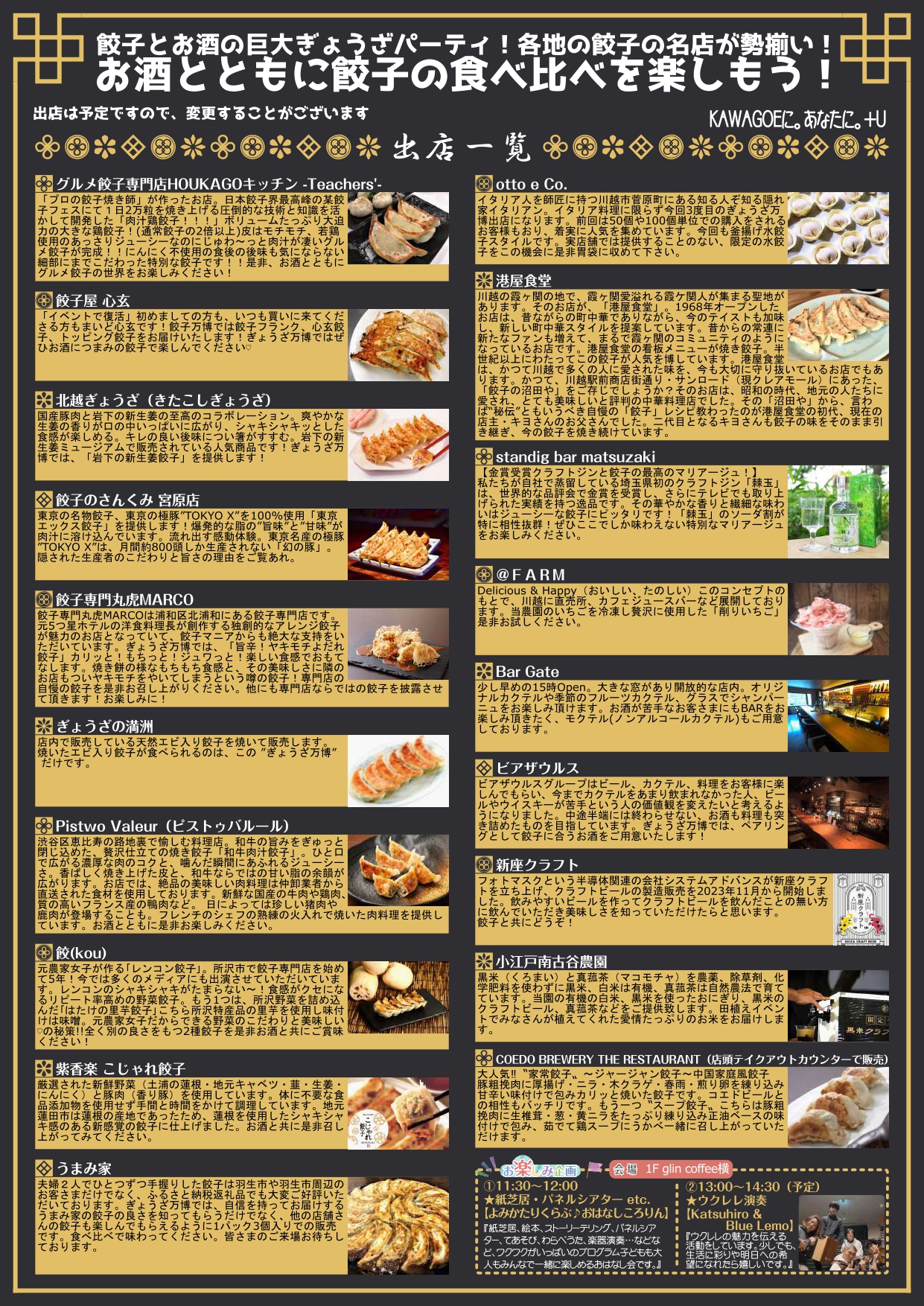 川越の人気店はじめ、県内・都内の人気店が集結する川越開催の餃子フェスです。今年はさらに初出店が増えます。クラフト餃子フェス出店でお馴染みのお店や、各地の餃子フェスでお馴染みのお店も川越にやって来ます。