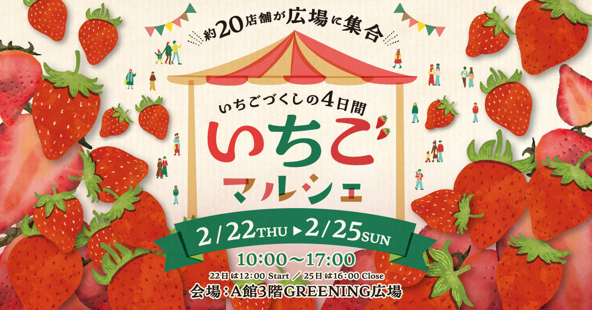 2024年2月22日(木)~25日(日)の4日間、今が旬の“いちご”をテーマにしたイベント「いちごマルシェ 」を開催します。A館3階GREENING広場に、約20店舗のいちごマルシェが登場します。美味しくて可愛い“いちご”で心も身体も満たさ...